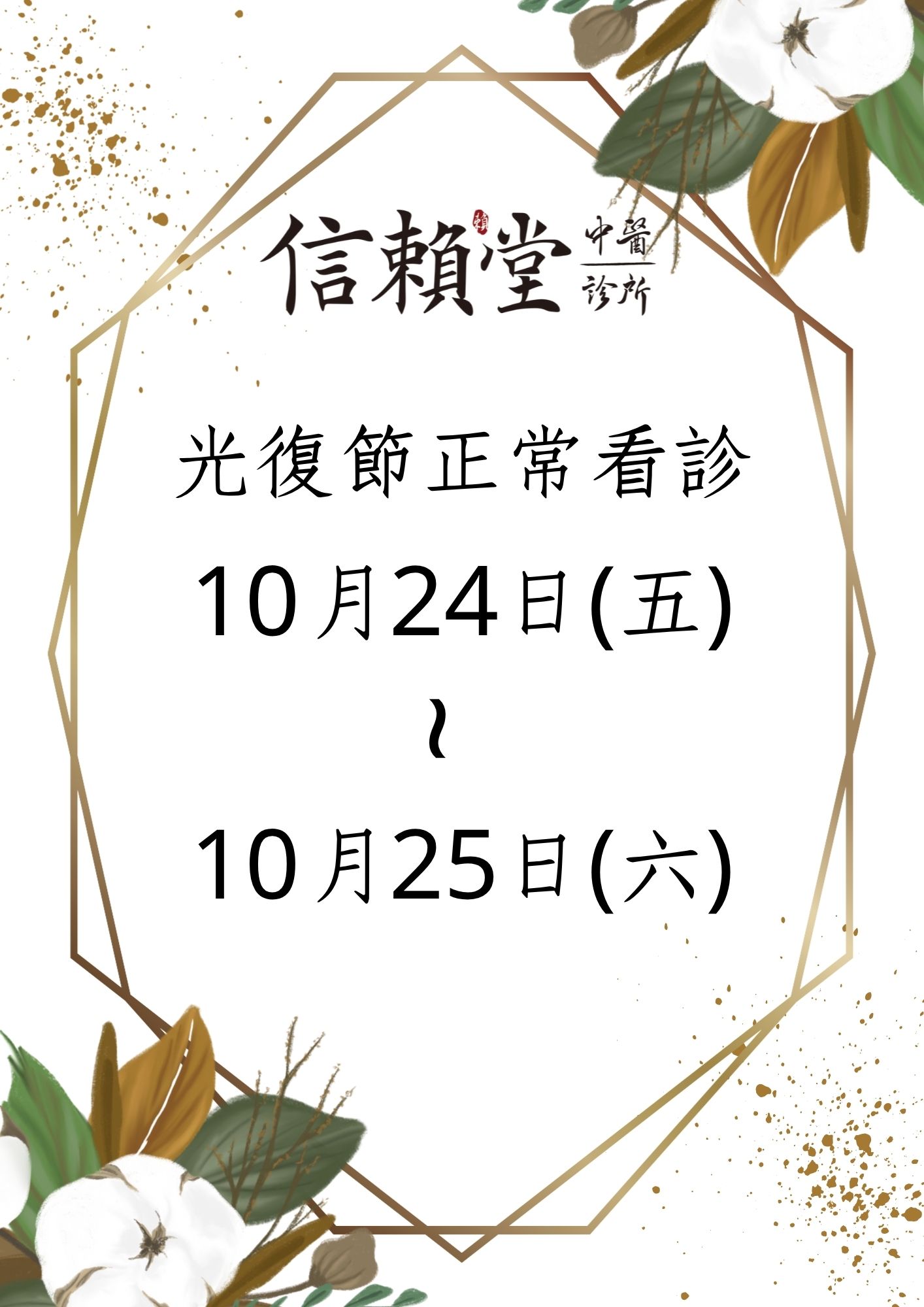 光復節10/24~10/25正常看診